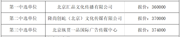 1、根據(jù)報價最低者中選法,我單位確定北京匯品文化傳播有限公司成為本次采購項目的中選供應商。